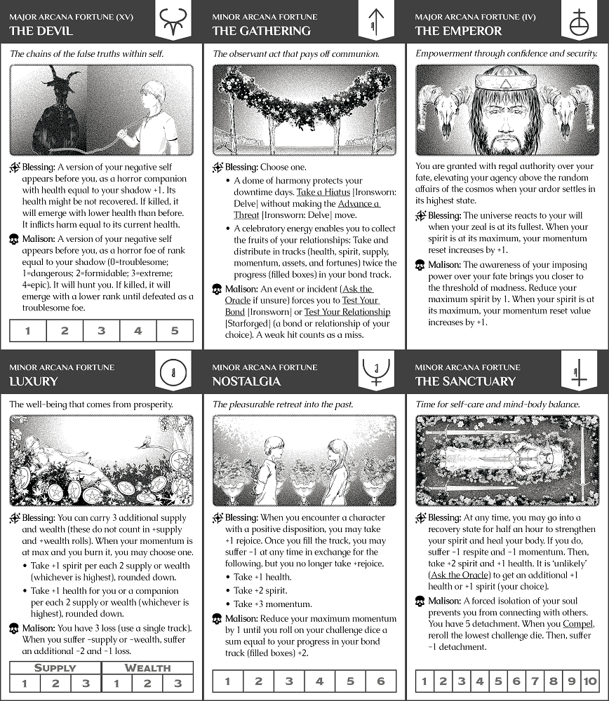 Besides the vanilla use of the deck, which implies the use of two self-contained moves to determine when you are worthy of drawing a card and what its effect is, the companion document offers 4 alternate uses for the Deck of Many Fortunes. You may also use this supplement as: