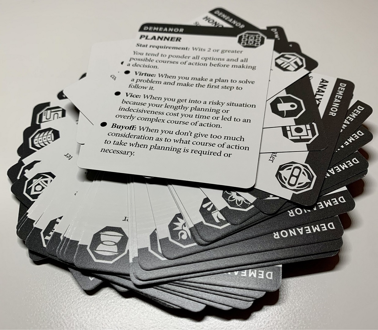 This set comprises 36 demeanor cards, each representing archetypical personality types. Using them lets you detail your character and give them depth and a unique feel. Playing with a demeanor will also serve as a compass and incentive to roleplay as appropriate to the narrative, and be mechanically rewarded by doing so.