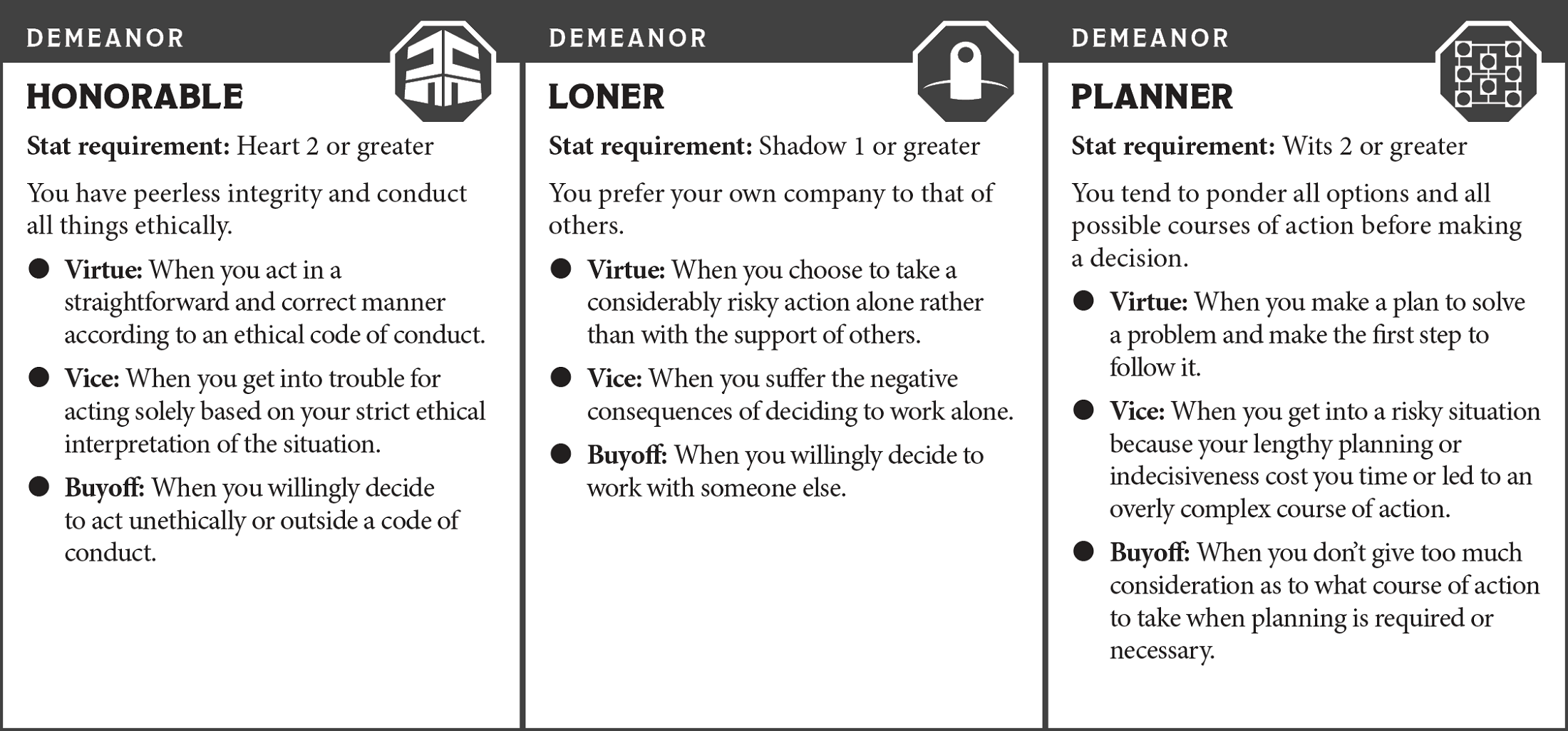 Each demeanor is composed of the virtue, the vice, and the buyoff.