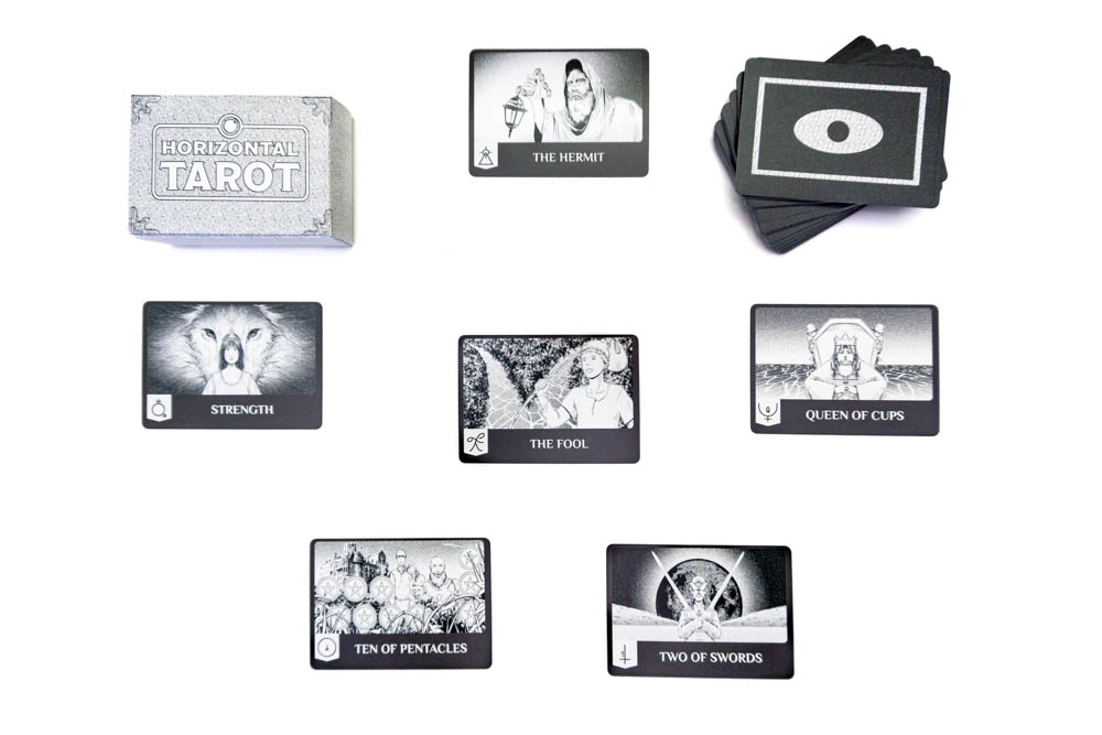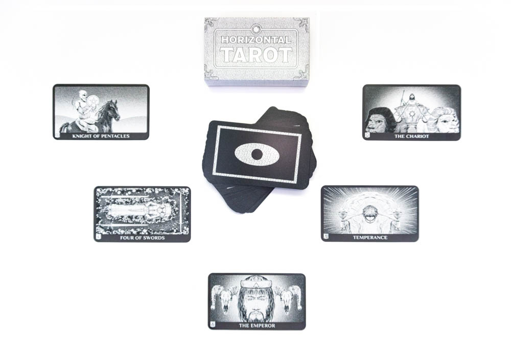 The Horizontal Tarot can be used for the enjoyment of its greyscale artwork or for games that utilize tarot mechanics.