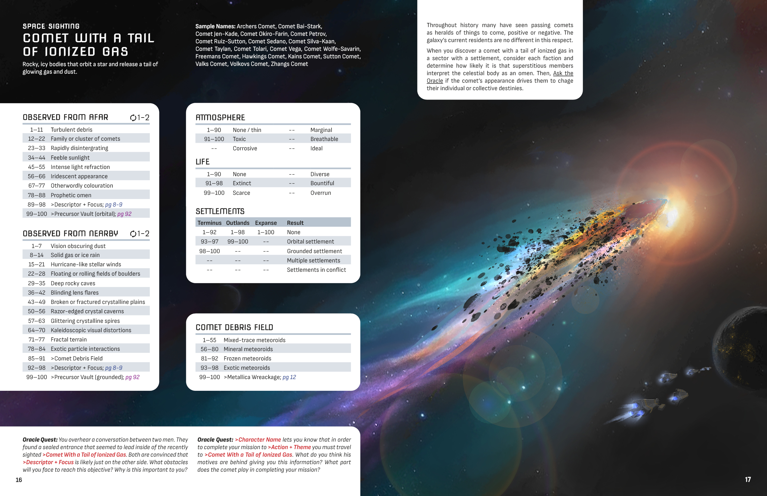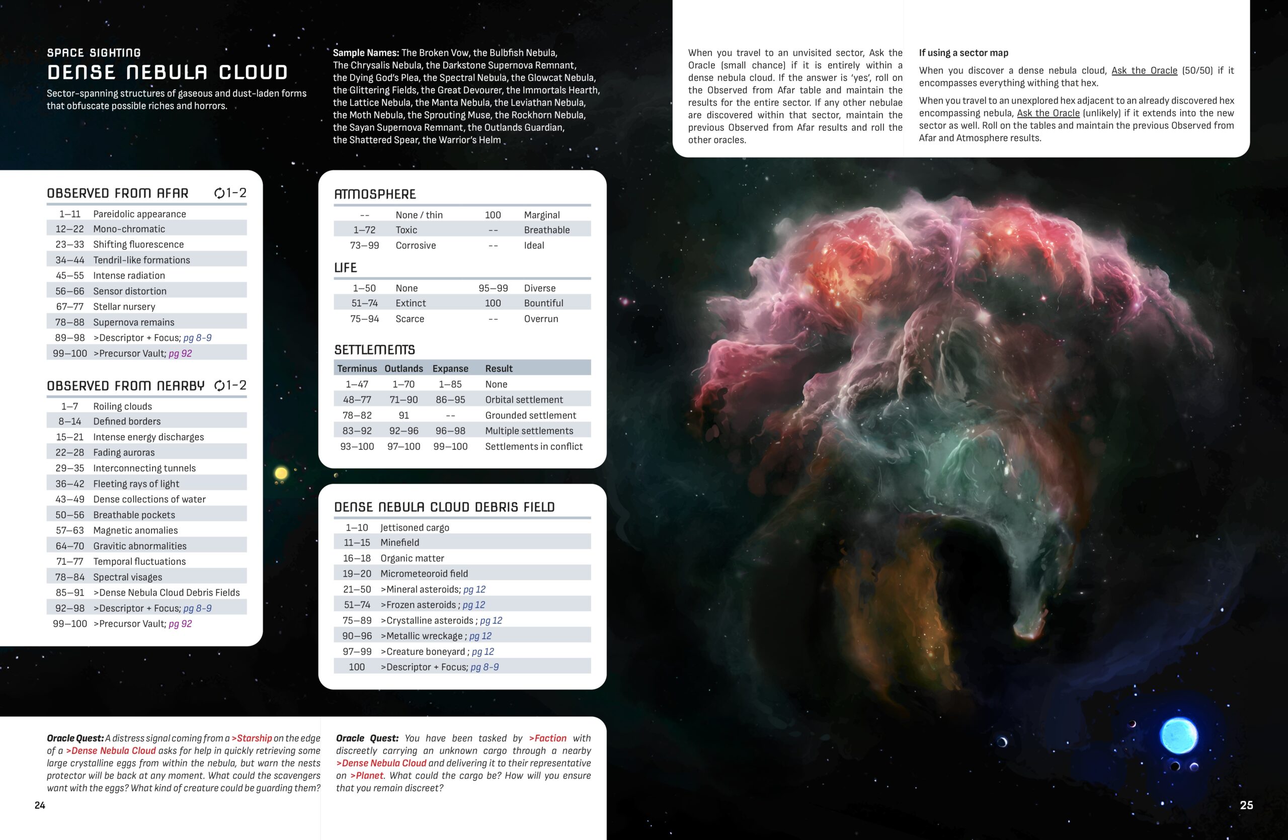 - Random tables for discoverable natural and unnatural phenomena, from debris fields to dense nebula clouds.