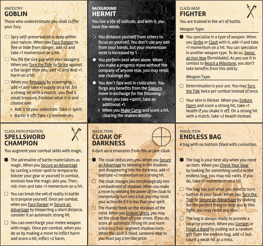 When you create a character, choose three assets: an ancestry, a background, and a class base. As your character progresses, their class specialization will be represented with a class path and they will acquire magic items along the way.